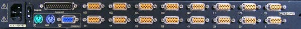 На задней поверхности — разъём питания с кнопкой отключения, VGA и два PS/2 для подключения внешней консоли. Выше один разъём DB-25 (широкий COM-порт) для организации цепочки. Один потому, что данное устройство логично использовать в качестве ведущего в инсталляции — оно уже содержит консоль. Там же 16 фирменных разъёмов формата D-Sub для подключения серверов.