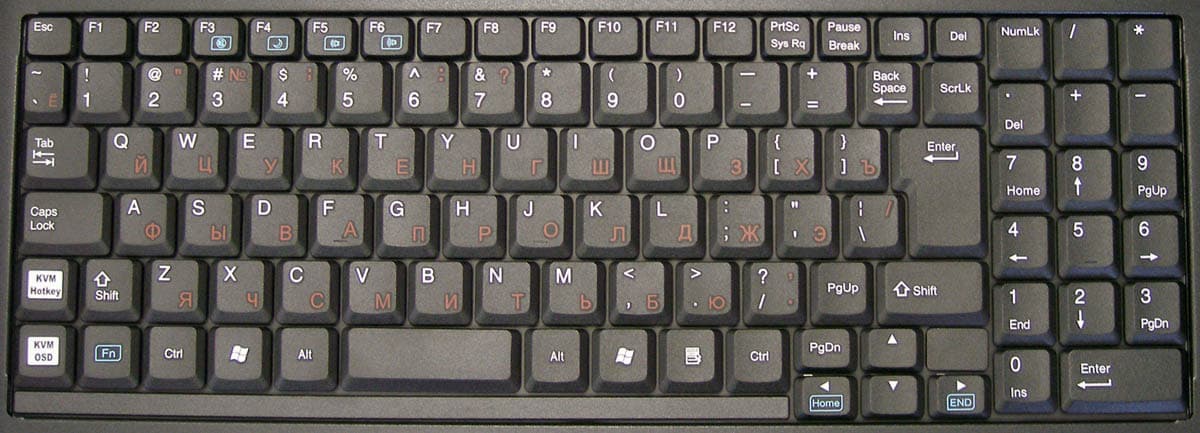 Клавиши плоские, полноразмерные, ход нажатия короткий, менее 2 мм. Нажатие мягкое, информативное, звук тихий. Механизм возврата клавиш — модифицированный купольный, крепление каждой клавиши — на металлическую рамку из двух половинок. Дрягаются клавиши немного, даже длинные. Все полноразмерные, кроме бо́льшей части верхнего ряда и курсорного блока, эти на треть уменьшены в высоту. Русские буквы тёмно-красные, что мало кому нравится. Основные символы белые, семь Fn — светло-голубые. Вся маркировка выполнена запрессовкой цветных кусочков пластика, практически вечная.