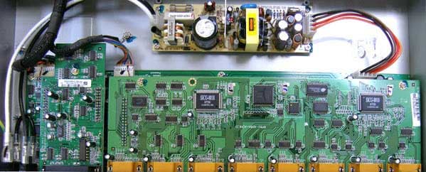 Монтаж на четырёх печатных платах, и ещё отдельно блок питания. Слева внизу модуль, отвечающий за работу второй консоли. Над ним находится платка для организации цепочки из переключателей. Для 16-портового устройства применяются две основных платы, в два этажа. Более глубинная разборка невозможна — разъёмы крепятся на винты, фиксированные лаком. Однако есть основания полагать, что нижняя основная плата аналогична верхней, которая хорошо видна.