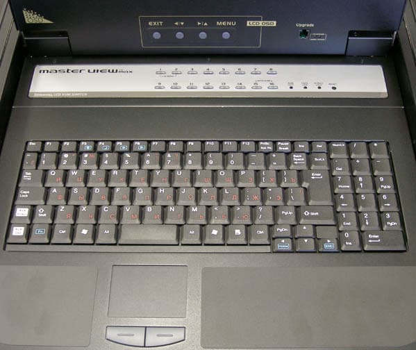 Под экраном находятся четыре кнопки для управления им при помощи меню. Рядом — гнездо RJ-11 для прошивки микропрограммы и переключатель выбора режима прошивки: плановая или аварийная. На горизонтальной части, за клавиатурой, 16 кнопок-индикаторов для переключения активного канала и индикации подключенных и выбранного портов. Нажатие одновременно 1 и 2 кнопок перезапускает KVM устройства, нажатие 15 и 16 запускает автоматическое сканирование портов. Тут же индикаторы регистров Lock и кнопка перезапуска консоли.