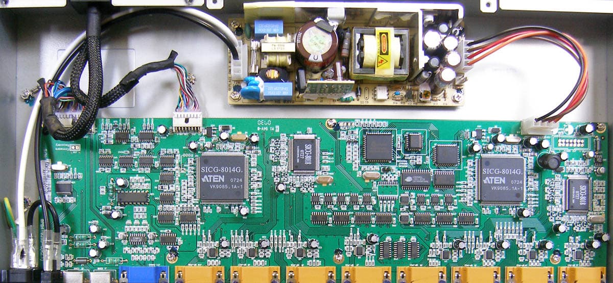 Вся логика смонтирован на одной печатной плате, и ещё отдельно блок питания. Основу составляют целых пять программируемых микроконтроллеров, по два собственного производства Aten SICG-8014G и SICG-8018 (которые используется только производителем и спецификации не опубликованы), а также Winbond W78E516B4OPL. Электронные переключатели производства Philips и конденсаторы для буферизации интерфейсов, и несколько микросхем с неразборчивой маркировкой. Сказать точно, чем занимается такое количество ASIC невозможно, их основное свойство как раз в программируемости, и в разных моделях они могут выполнять совершенно разные функции.