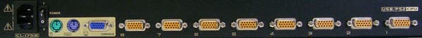 На задней поверхности разъём питания с кнопкой отключения, VGA и два PS/2 для подключения внешней консоли и восемь фирменных разъёмов формата D-Sub для подключения серверов.
