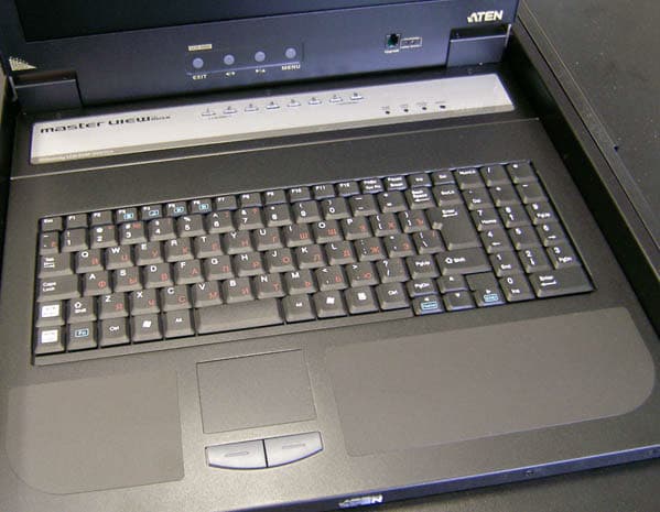 Итак, Master View Max Slideaway LCD KVM Switch ATEN CL-1758MR-B устройство для монтажа в стандартную 19" стойку высотой 1U, содержащее 17" ЖК-монитор, клавиатуру с русской раскладкой и тачпад. Также встроен восьмипортовый переключатель консоли, поддерживаются ПК с интерфейсом PS/2 и USB. Оснащено портом для подключения внешнего, работающего параллельно с основным, комплекта из монитора, мыши и клавиатуры (дополнительной внешней консоли). Возможно объединение в трёхуровневый Cascade. Теперь подробнее.