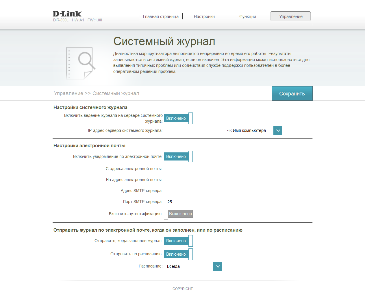 Рассматриваемая модель ведет собственный журнал событий, однако из веб-интерфейса посмотреть его почему-то нельзя. Предлагается использовать или внешний сервер syslog для хранения информации или отправлять записи на электронную почту по расписанию или при заполнении.