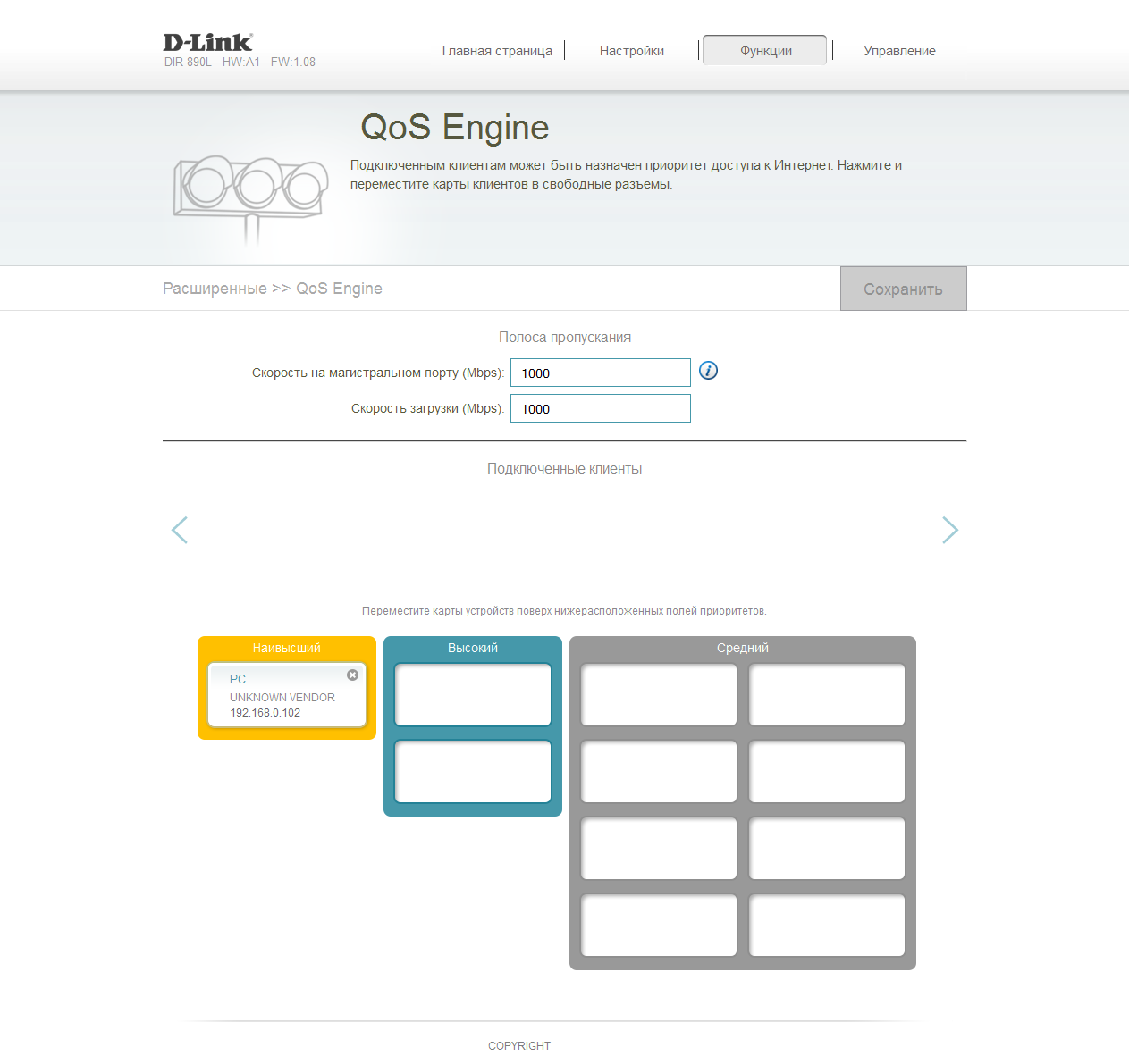 Роутер имеет высокопроизводительную платформу и ее ресурсы предлагается использовать в частности для реализации системы приоритезации трафика QoS Engine. Здесь сначала нужно указать скорости приема и передачи вашего интернет-канала, а потом распределить клиентов локальной сети в три группы с наивысшим, высоким и средним приоритетом. Всего для этих категорий предусмотрен один, два и восемь слотов. Остальные устройства локальной сети получают низкий приоритет. К сожалению, несмотря на быстрый процессор, работа данного сервиса существенно ограничивает максимальную производительность устройства на гигабитных подключениях. Впрочем, для популярных тарифных планов до 100 Мбит/с включительно это не существенно.