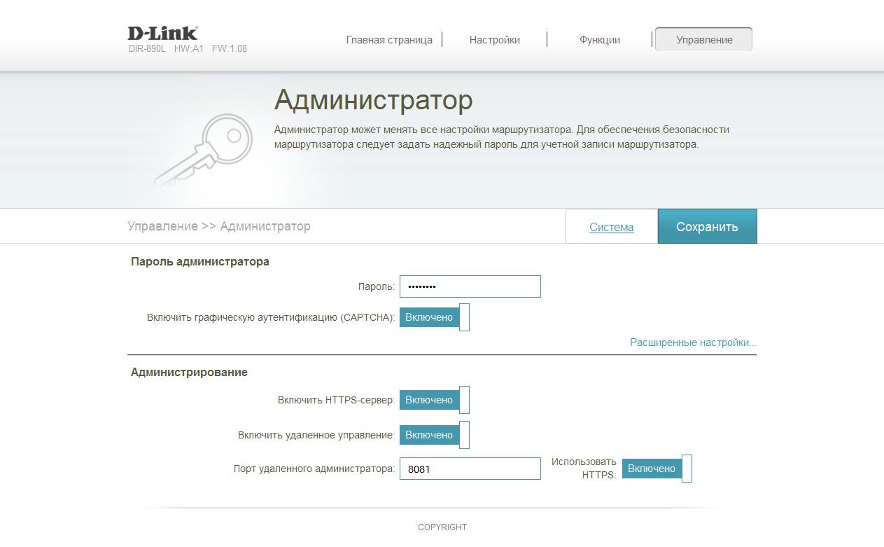 Набор системных функций вполне привычный — обновление прошивки, сброс/сохранение/восстановление конфигурации, перезагрузка роутера, изменение пароля администратора. Отметим, что есть интересная функция дополнительной защиты доступа к настройкам с использованием Captcha.