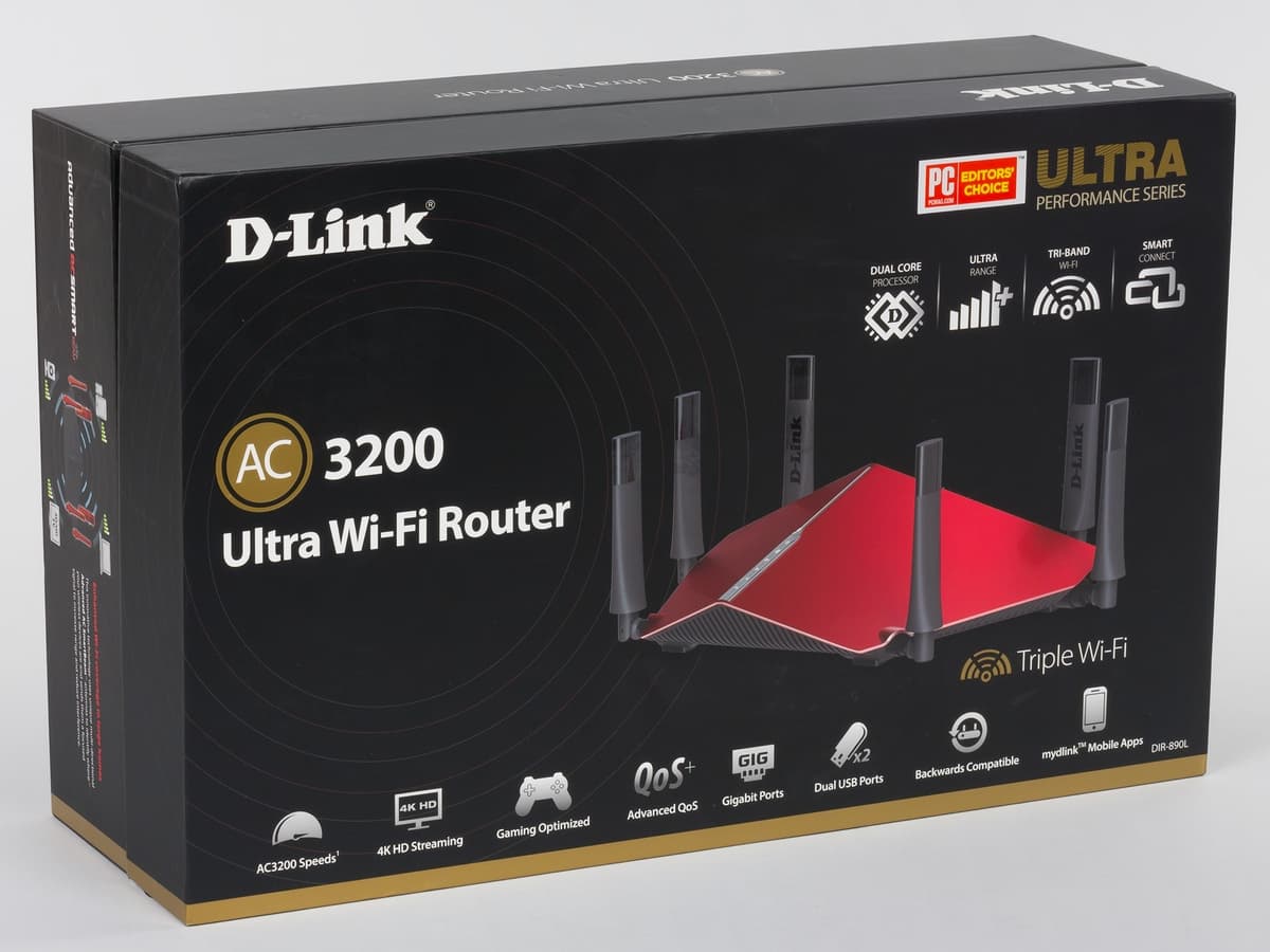 В этом материале мы рассмотрим занимающую верхнюю позицию в линейке модель D-Link. DIR-890L был анонсирован в начале этого года на CES 2015. Второе его название — AC3200 Ultra Wi-Fi Router. Также в серию вошли еще две модели, DIR-895L и DIR-885L, которые производитель относит к классам AC5300 и AC3100 соответственно. Кстати, для них заявлена поддержка MU-MIMO, так что будет интересно протестировать ее, когда устройства окажутся доступны.