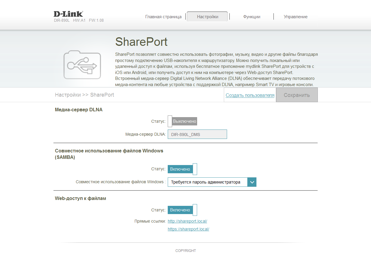 В прошивке также присутствует сервер DNLA. Никаких настроек у него нет, кроме включения. Индексируются сразу все подключенные диски. Он поддерживает многие популярные форматы медиафайлов, включая jpeg, mp4, flac, m4a, avi, mkv, mp4, mpeg и другие.