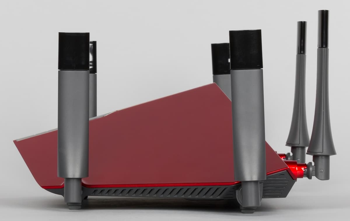 Шесть несъемных антенн роутера установлены симметрично — по паре на боковых сторонах и две сзади. У антенн есть по две степени свободы (вращение на 180 градусов и наклон на 90 градусов), а длина подвижной части составляет 12,5 см.