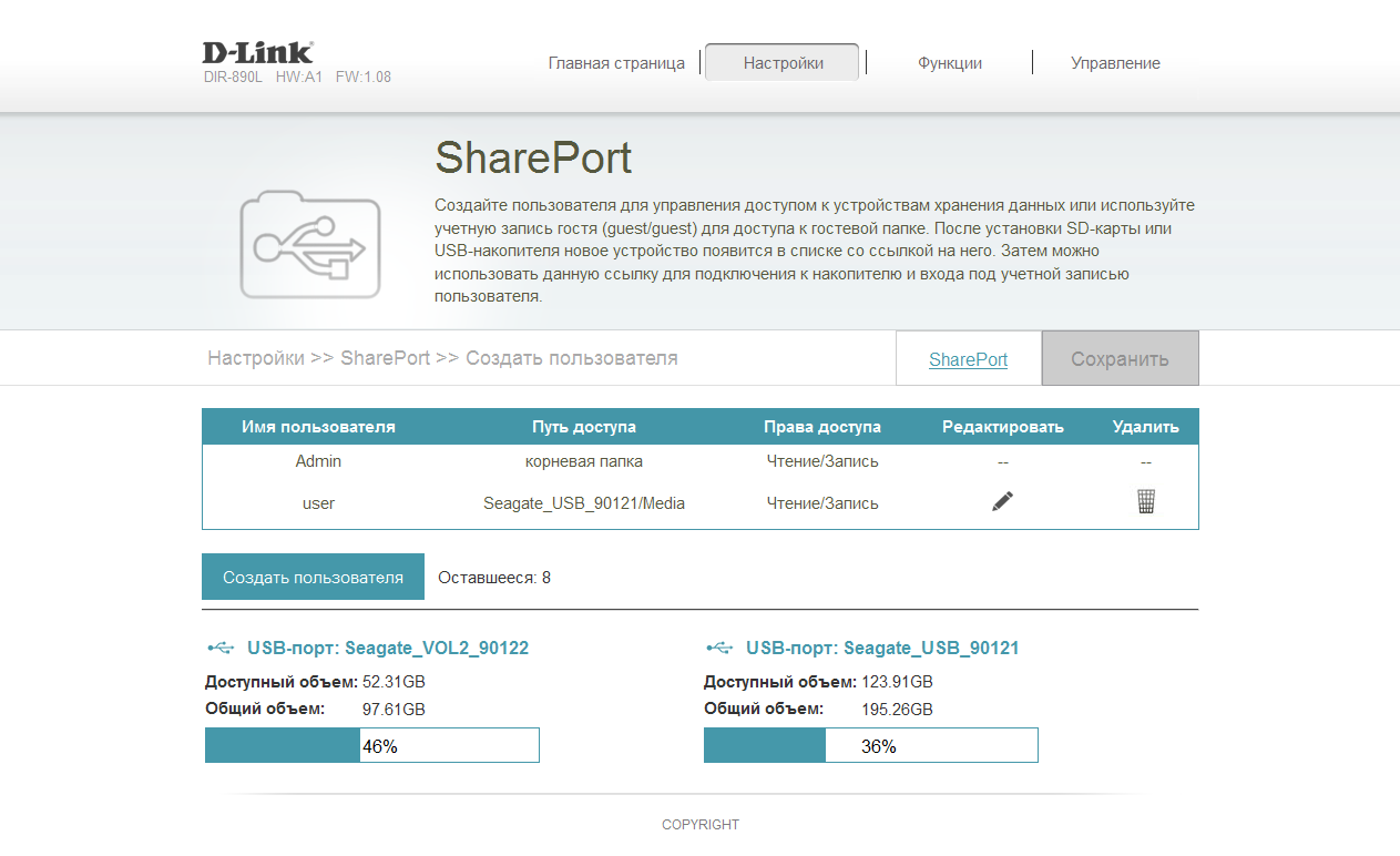 Порты USB роутера могут использоваться для подключения внешних накопителей с соответствующим интерфейсом. При этом допускается наличие нескольких разделов на дисках, а набор поддерживаемых файловых систем ограничен FAT32 и NTFS. Каждый раздел представляется отдельным сетевым ресурсом. Безопасного отключения накопителя не предусмотрено. Если не хватает двух портов, можно воспользоваться хабом (это работает только с USB 2.0). В веб-интерфейсе можно найти информацию о подключенных дисках, но там отображается не более двух разделов.