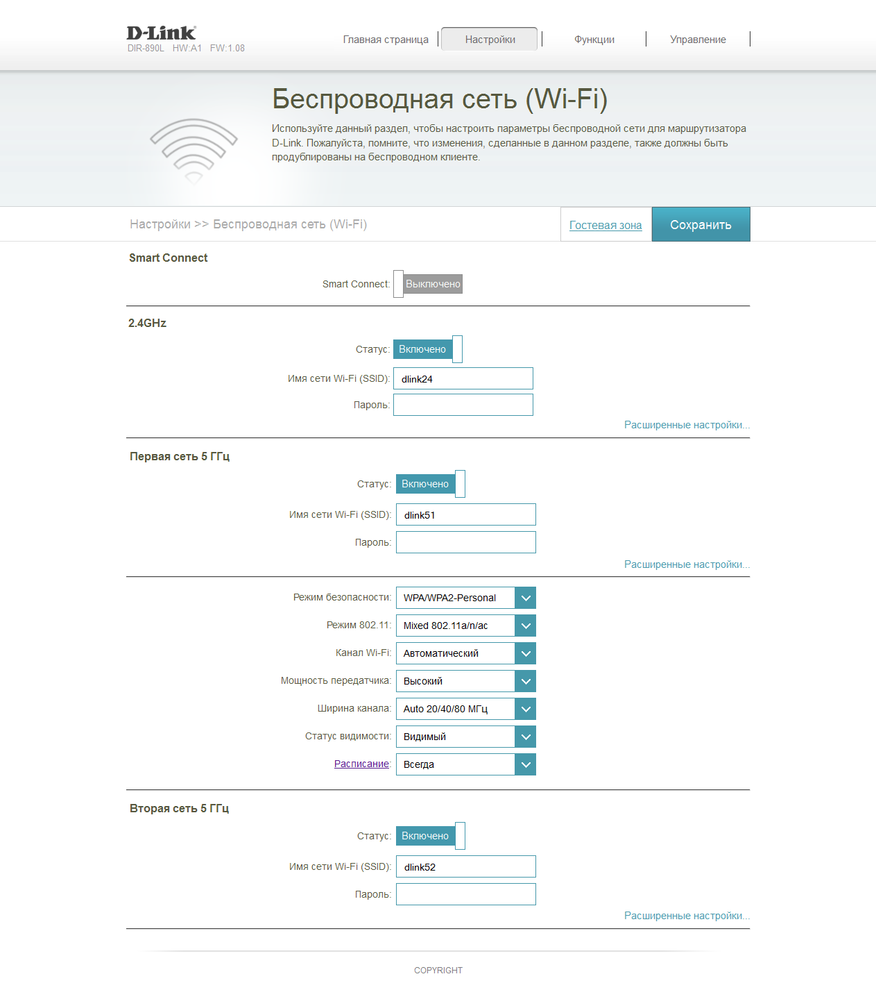 Так что вероятно чаще будет использоваться отключение режима и создание трех точек доступа с индивидуальными именами, что позволит пользователю самостоятельно распределить клиентов по ним. В настройках каждой, кроме указанных выше параметров, есть выбор режима по стандартам Wi-Fi, номера и ширины канала, скрытие трансляции SSID. Первая точка доступа на 5 ГГц позволяет работать с каналами 36—64, а вторая — 132—140 и 149—165, так что пересекаться они не будут.