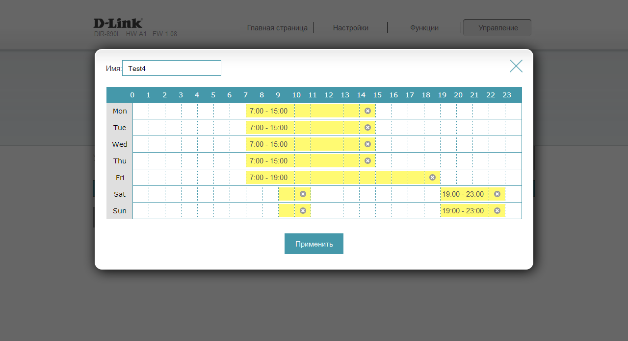Роутер имеет несколько функций, связанных с использованием времени, включая доступ клиентов, работу беспроводных сетей, правила фильтрации и перенаправления портов. Так что в разделе «Управление», прежде всего, нужно проверить корректную настройку встроенных часов. Здесь предусмотрен выбор часового пояса и синхронизации через интернет. На второй вкладке можно запрограммировать несколько недельных расписаний с точностью до часа и потом ссылаться на них в правилах.