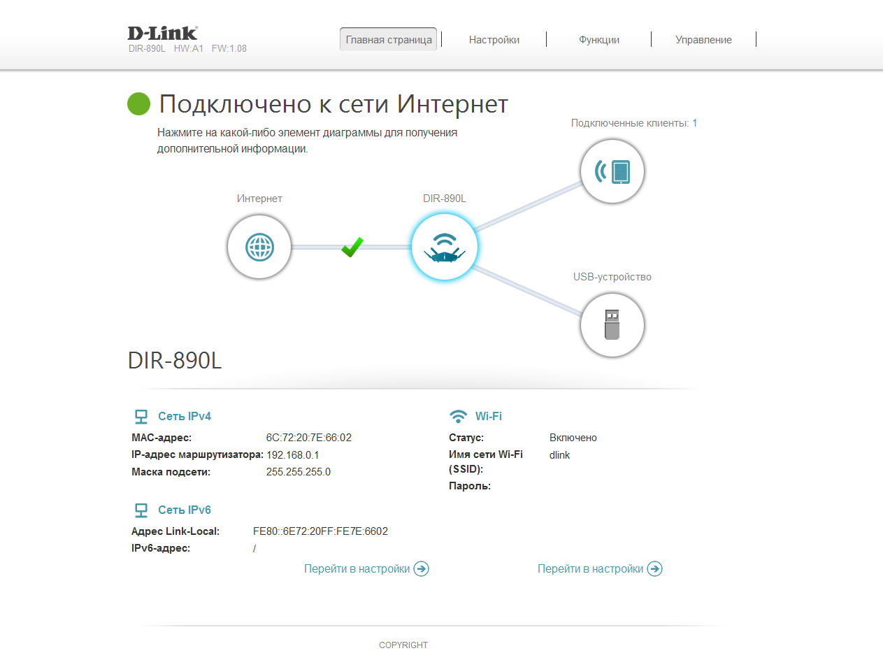 Дизайн интерфейса простой и достаточно удобный. На первой странице, которую пользователь видит после входа, отображается графическая схема сети. Здесь можно проверить статус подключения к интернету, адреса роутера, параметры беспроводной сети, получить информацию о клиентах в локальной сети. Многие из пунктов имеют ссылки на соответствующие страницы настроек.
