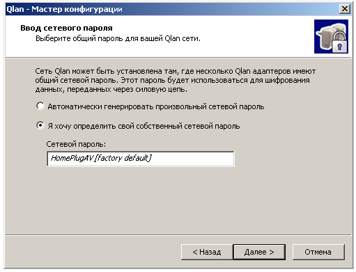 Следующим этапом идет настройка безопасности: мастер конфигурации может сгенерировать пароль безопасности самостоятельно (при этом пользователю он будет недоступен), а также дает задать его пользователю. Настраиваемый вид безопасности аналогичен WPA-PSK в Wi-Fi-сетях — на данном шаге мастера мы как раз задаем предварительный (PSK) ключ. Также напомню, что данное устройство "подчиняется" стандарту HomePlug AV и использует алгоритм шифрования AES с длиной ключа 128 бит (в отличии от HomePlug 1.0 устройств, которые используют 56-битное DES-шифрование).