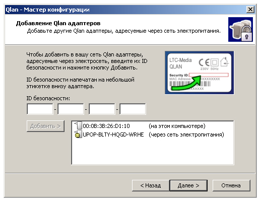 Следующим шагом мы выбираем устройства, которые мы настраиваем для работы в одной сети. Мастер видит и готов к настройке только устройства, непосредственно подключенного к нашему компьютеру. Для настройки удаленных устройств потребуется ввести ID безопасности (Security ID, его можно найти на задней стенке устройства) других устройств, доступных через силовую сеть. Нужно учитывать, что добавляемые устройства должны быть включены и не должны находится в спящем режиме.