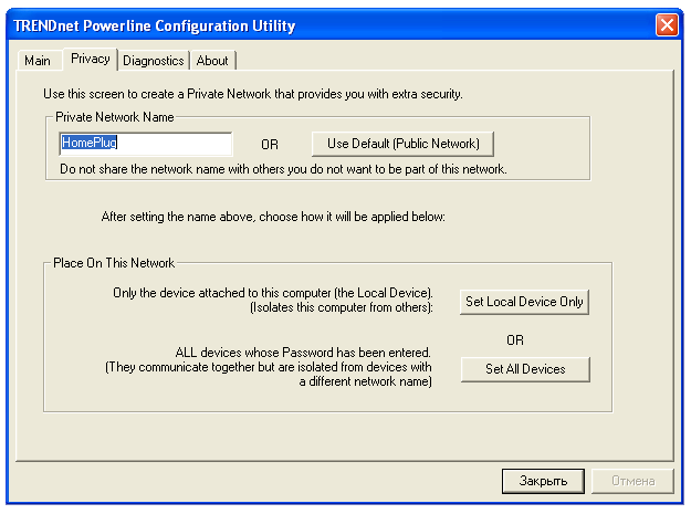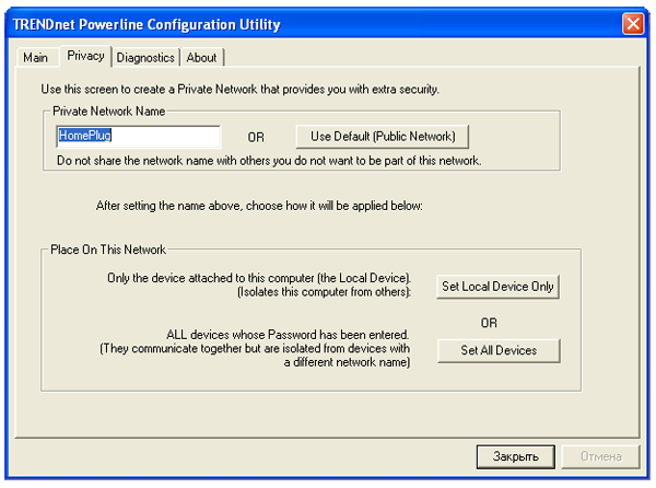 После этого можно произвести настройку ключа шифрования (по умолчанию используется ключ "HomePlug" без кавычек). Задать ключ шифрования можно либо только для локального устройства (непосредственно подключенного к компьютеру) либо сразу для всех устройств из списка. Устройства имеют связь друг с другом только при одинаковом названии сети (Private Network Name) — это же название служит своеобразным ключом для шифрования передаваемых данных.