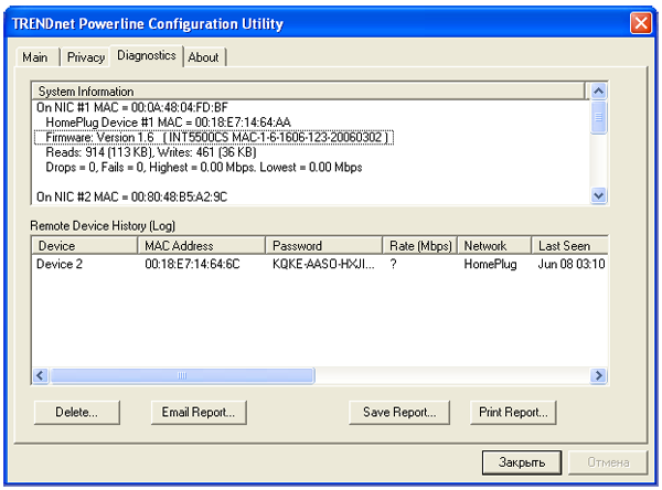 Здесь отображается статистика сетевых HomePlug-адаптеров.