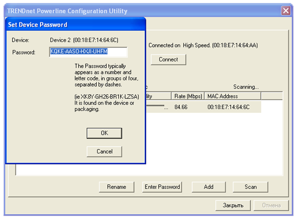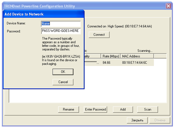 Без пароля устройства можно настроить только то устройство, которое непосредственно подключено к компьютеру. Для настройки остальных устройств подключенных через электросеть потребуется сначала ввести пароль (для каждого из устройств), расположенный на нижней стороне HomePlug адаптера, Параллельно можно опционально задать название устройства (для удобства запоминания каким устройством мы управляем).