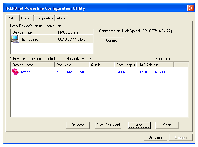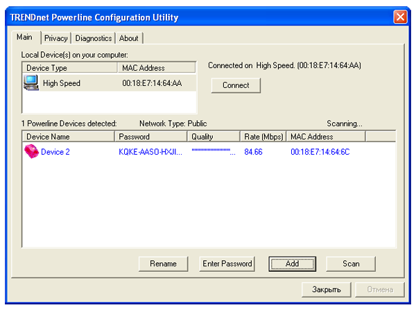 Здесь отображаются текущие устройства, обнаруженные в нашей HomePlug-сети. В верхнем окошке отображается устройство непосредственное подключенное к данному компьютеру. В нижнем — устройства доступные по электропроводке — здесь отображаются только те устройства, с которыми у нас настроена связь. Если связь не настроена, то такое устройство нужно добавить (кнопка Add) к нашей сети. Для добавления устройства необходимо знать пароль данного устройства, который напечатан на наклейке снизу устройства. Кнопка "Enter Password" используется в том случае, если устройства уже объединены в одну сеть, но при этом пароль еще не вводился — это может произойти если сеть настраивалась с одного компьютера, а потом потребовалось внести изменения в настройки с другого компьютера.