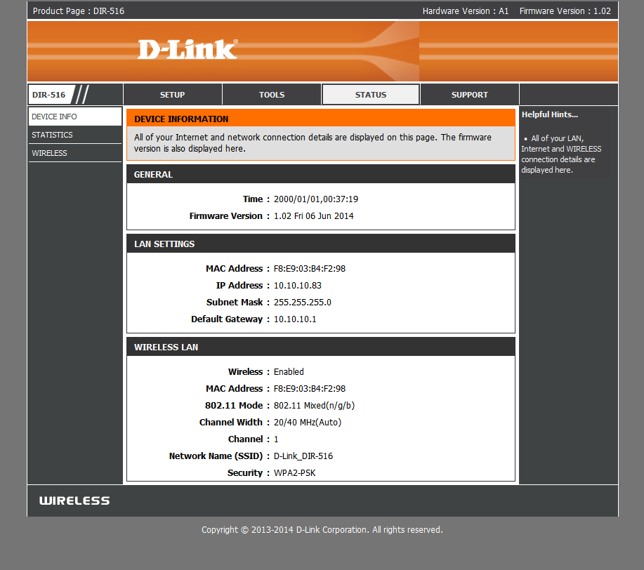 Веб-интерфейс не имеет парольной защиты «из коробки». Его внешний вид аналогичен другим традиционным устройствам D-Link. В верхней части окна мы видим аппаратную и программную версии модели. Ниже идут четыре пункта верхнего уровня меню. Список доступных страниц показывается в левой части страницы. Заметим, что язык у меня только английский. Формально предусмотрено использование модулей перевода, но для данной модели мы их не обнаружили на сайте поддержки.