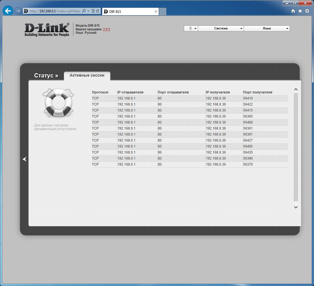 Отдельной страницы статуса устройство не имеет. Но можно оценить ситуацию по отдельным страницам одноименного раздела. Сетевая статистика предоставляет данные по объему переданного и полученного трафика по интерфейсам (WAN, LAN и WLAN). Правда не очень понятно, с какого момента они считаются и нет возможности принудительного сброса счетчиков. В этом же разделе можно посмотреть список клиентов DHCP, таблицу маршрутизации и текущие сетевые сессии.