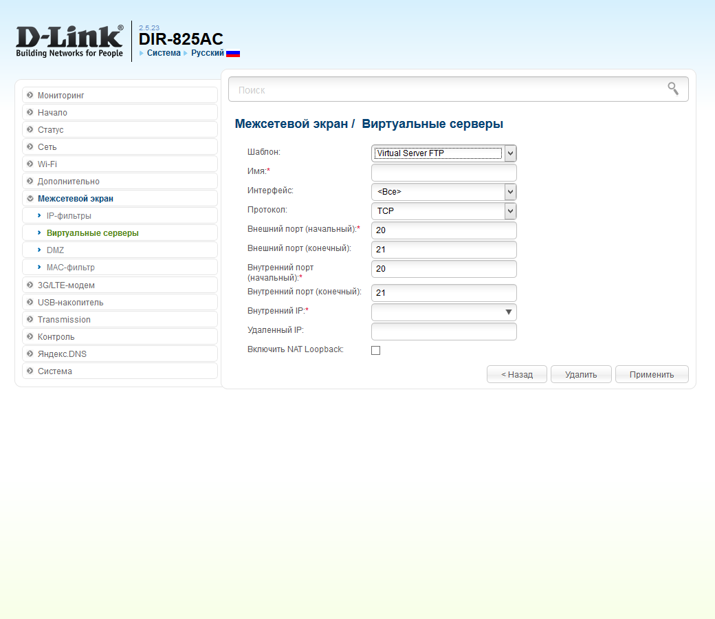 Те же аккаунты пользователей используются и для FTP. По умолчанию сервер работает только в локальном сегменте сети, но можно включить и доступ из интернета правилом трансляции порта. Он не имеет опции анонимного доступа, но позволяет изменить основной номер порта, поддерживает пассивный режим и кодировку UTF-8.