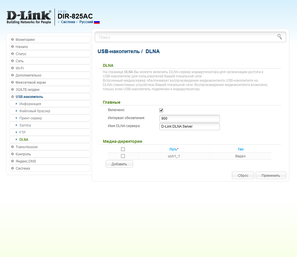 В прошивке есть встроенный сервер DLNA, который может пригодиться для трансляции мультимедиа на совместимые телевизоры. Он поддерживает выбор времени обновления базы и позволяет запрограммировать несколько директорий для файлов с указанием их категории. Индексируются многие современные форматы, включая jpeg, mp3, wma, flac, m4a, avi, ts, mkv, mp4, mpg, wmv и другие.