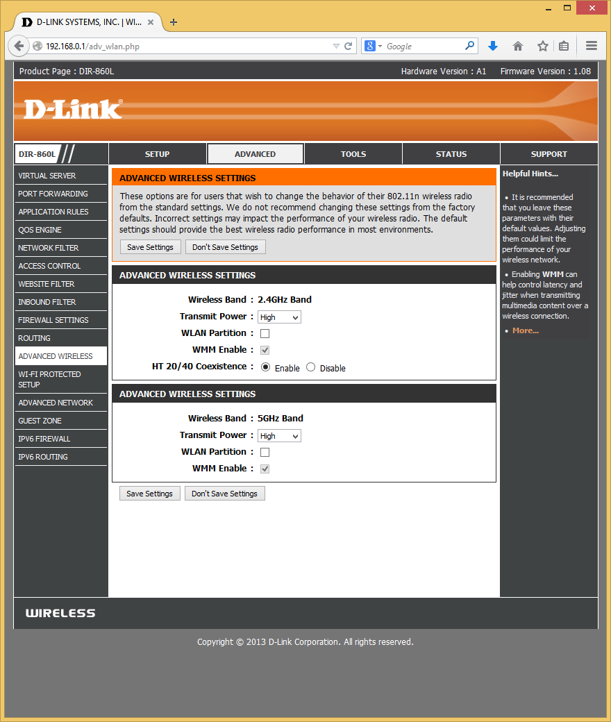 Роутер оборудован двумя независимыми беспроводными точками доступа. Стандартный набор опций позволяет установить имя сетей, режим 802.11, номер канала (для 5 ГГц поддерживаются каналы 36—64), его ширину, режим защиты (открытая сеть, WEP, WPA с паролем или через сервер RADIUS). Дополнительно можно использовать расписание и выбрать один из трех вариантов выходной мощности передатчиков. Упомянем также поддержку технологии WPS.