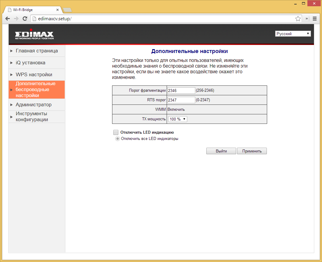 Стоит заметить, что данная модель работает именно как полностью прозрачный мост: подключаемые к ней клиенты будут взаимодействовать с DHCP-сервером основного роутера для получения настроек IP-адресов. Устройство также будет иметь собственный адрес, через который в дальнейшем можно будет обратиться к его веб-интерфейсу. Он представлен на нескольких языках, включая русский. Настроек у устройства совсем немного.