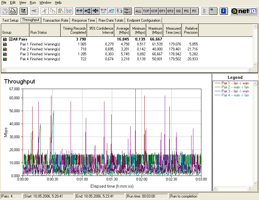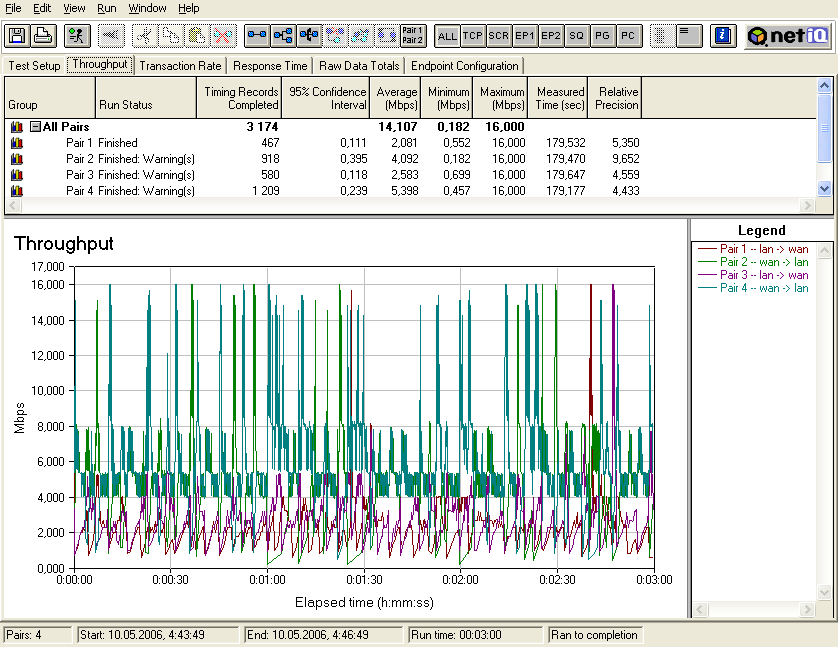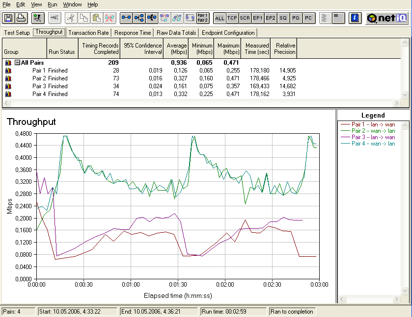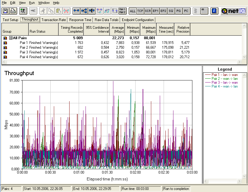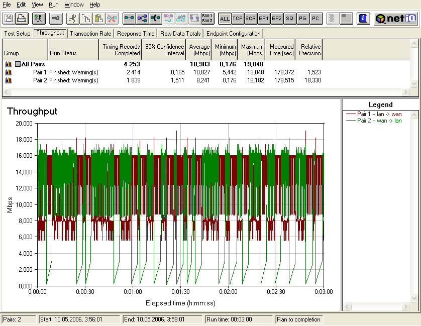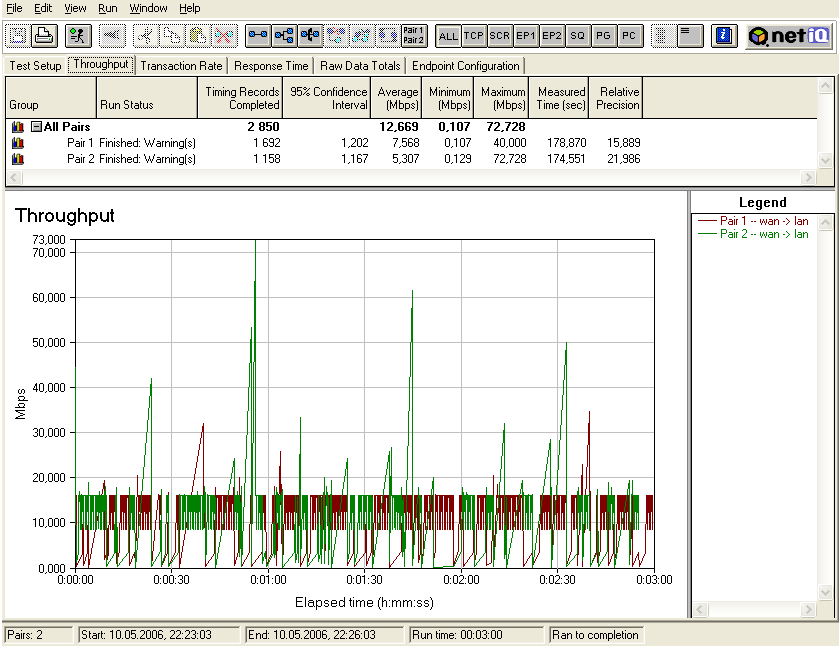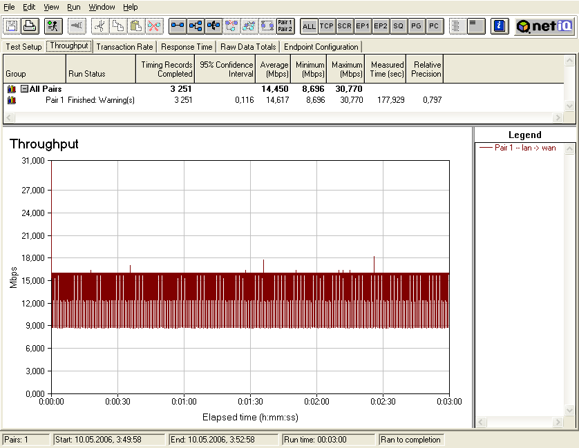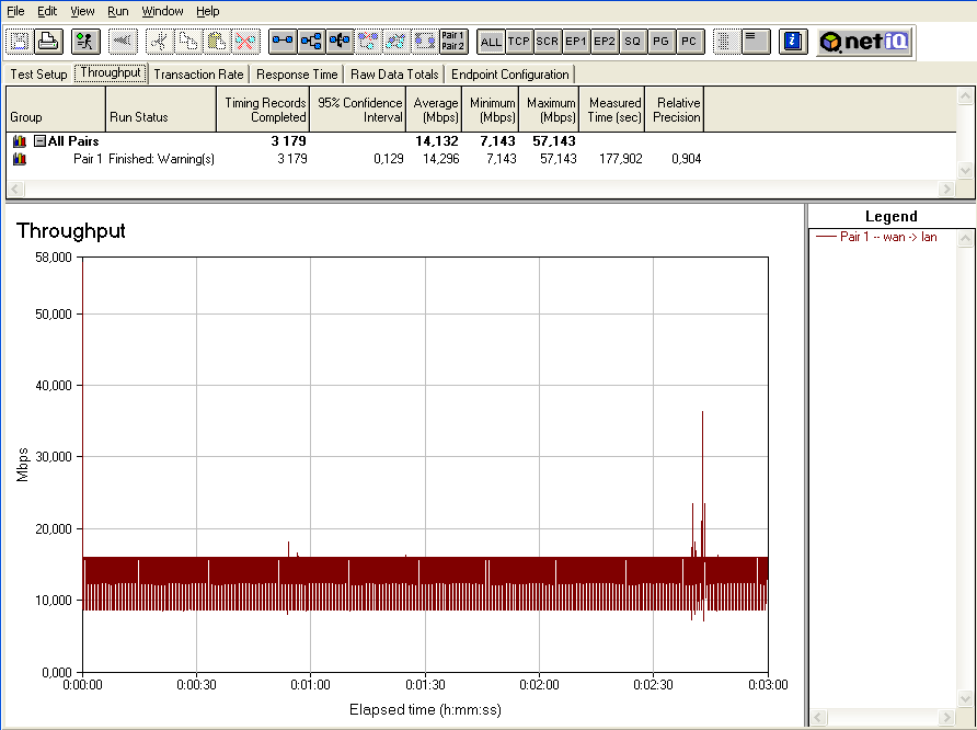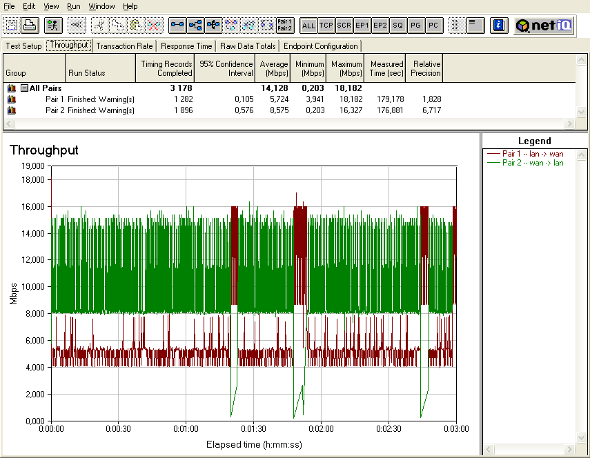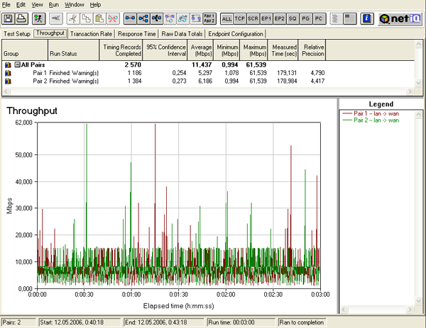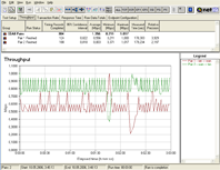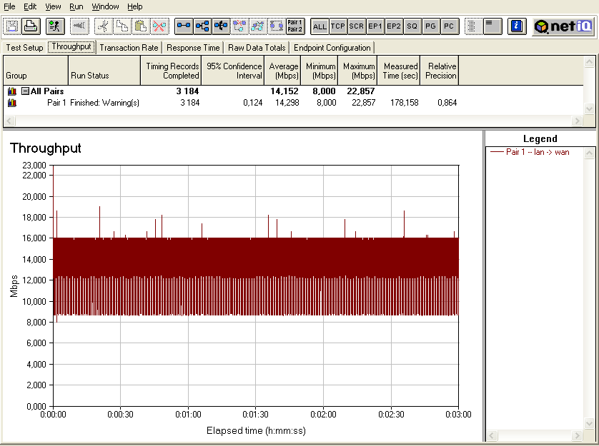 При использовании каналов с шириной полосы 15000 кбит/с скорость трафика в полудуплексном режиме в направлении LAN -> WAN несколько возрастает, а в обратном направлении несколько падает, но изменения скоростей очень незначительны. В полнодуплексном режиме суммарная скорость немного выше 22 Мбит/с — это в 1,5–2 раза выше чем в полудуплексном режиме, но даже до 30 Мбит/с это явно не дотягивает.