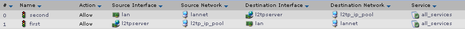 После этого необходимо создать правила файрвола, позволяющие прохождение трафика через L2TP-туннель. Правила нужно создавать только для L2TP-интерфейса, для IPSec-интерфейса правила создавать не требуется