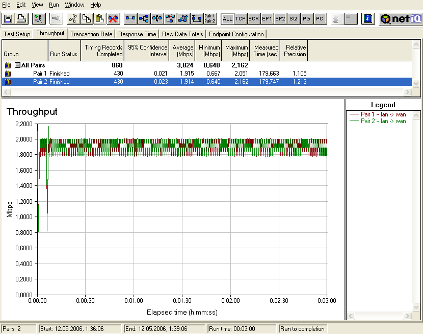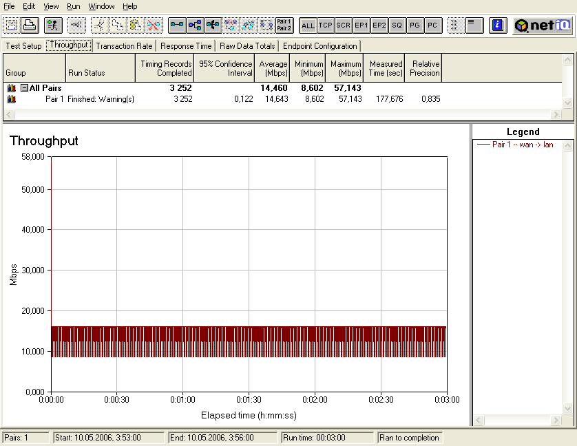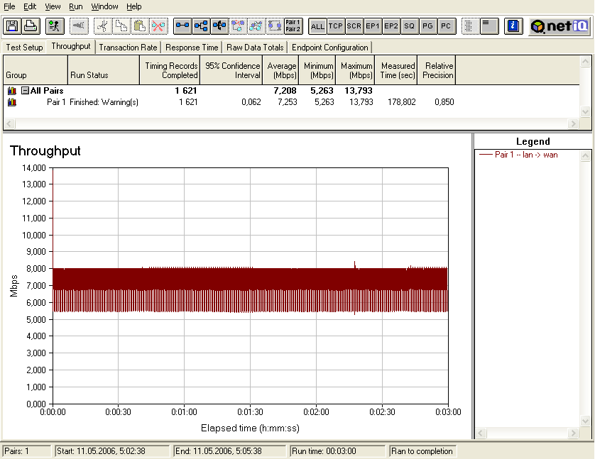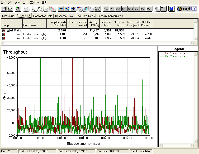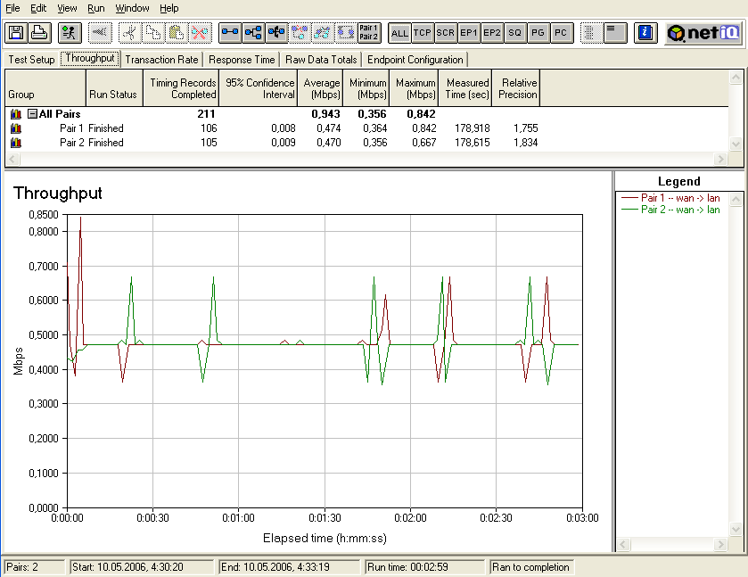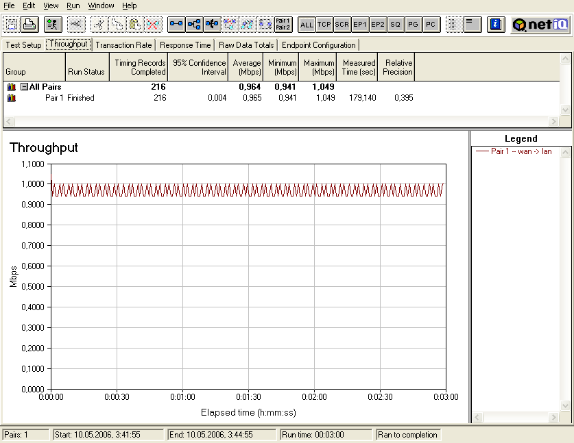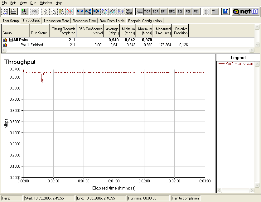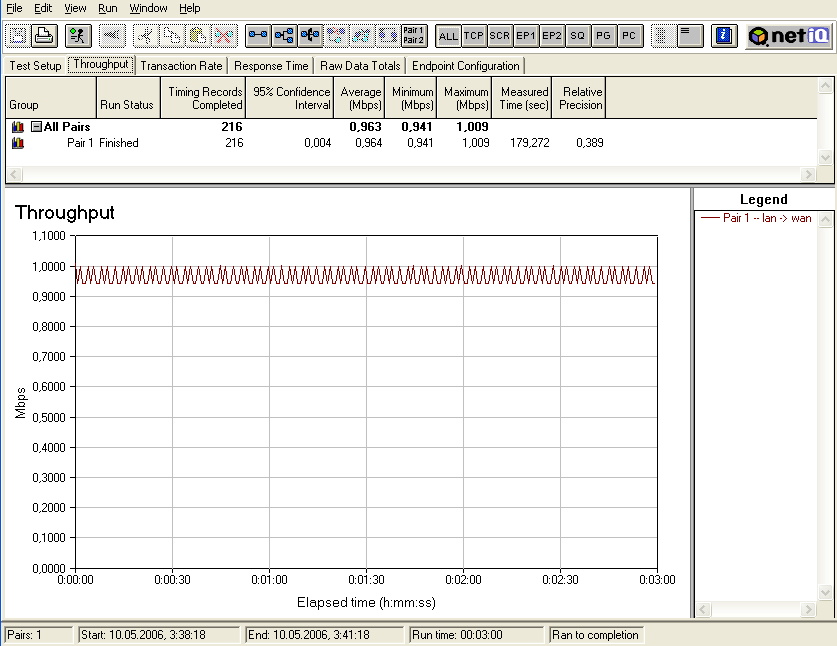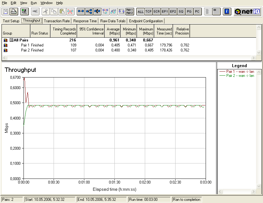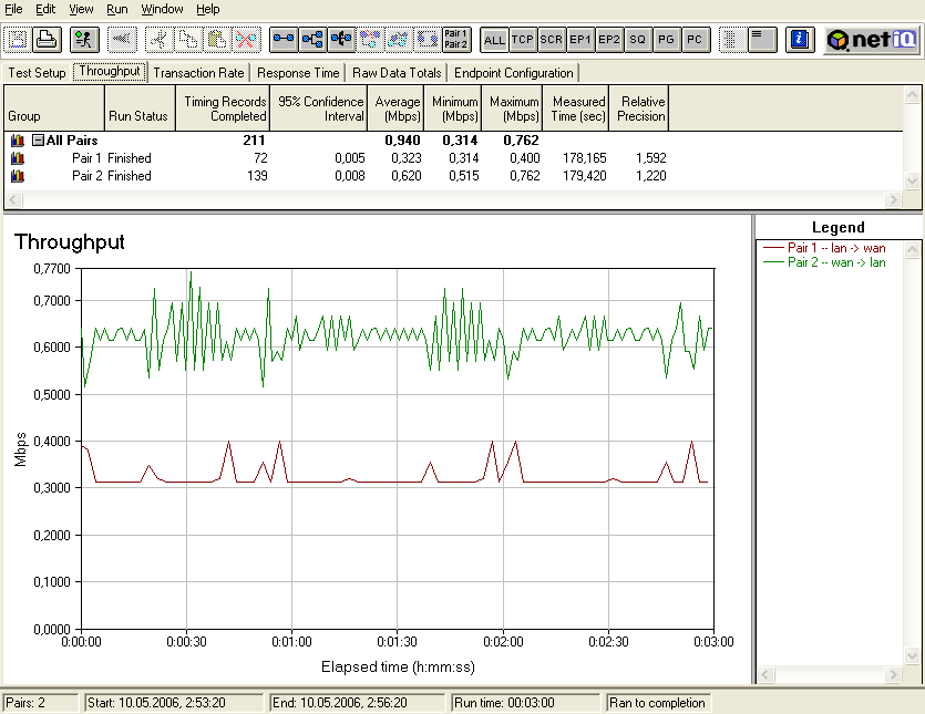 Как и ожидалось, скорость будет ограничена меньшим из значений ширины полосы, то есть около 3000 кбит/с.