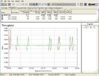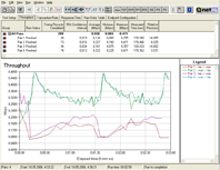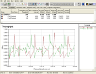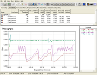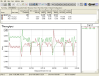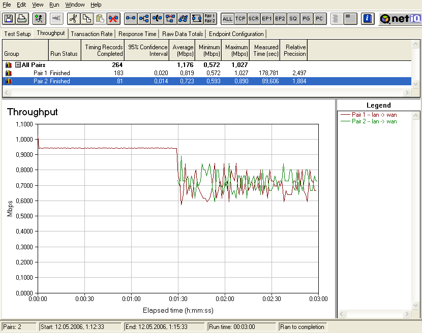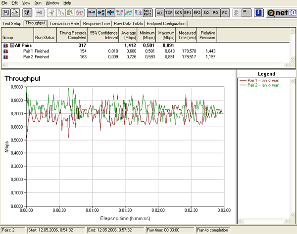 Можно заметить, что до запуска 2-го потока, скорость составляет чуть менее 1000 кбит/с, а когда запущены оба потока — скорость каждого держится на уровне 700 — 750 кбит/с (то есть суммарная скорость двух потоков ограничена уровнем ~1500 кбит/с).