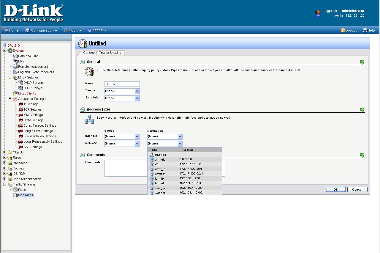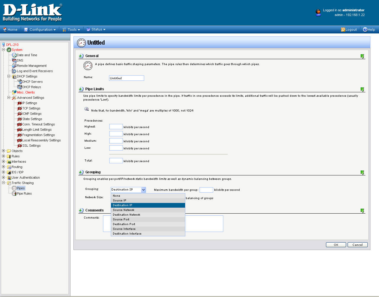Шейпинг трафика в файрволе D-Link DFL-210 основан на использовании каналов (или "труб", Pipes). Каналы задают общую ширину полосы пропускания, а также ширину полосы для трафика с различными значениями битов ToS (Type of Service). IP-пакеты имеют поле длиной в 1 байт, несущее информацию о ToS. 3 бита в этом поле позволяют установить 8 значений приоритета трафика (от 0 до 7, чем выше значение — тем выше приоритет). Устройство разделяет трафик который может иметь 8 приоритетов на 4 группы (по 2 значения приоритета на каждую шруппу): Low, Medium, High, Highest. Настройки каналов позволяют задать ширину полосы пропускания для каждой группы.