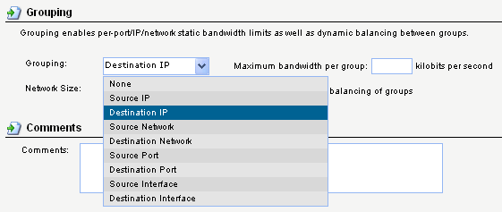 Настройки каналов имеют возможность группирования — рассмотрим вкратце эти возможности. Задав каналу параметр группирования по какому либо признаку, мы можем изменить ширину полосы пропускания, попадающую под эти признаки. Поясню на примере: ограничим общую ширину полосы пропускания канала значением 15000 кбит/с (LAN -> WAN), зададим его группировку по признаку Source IP (IP-адрес источника пакетов) и зададим групповое ограничение полосы пропускания 2000 кбит/с. Таким образом максимально возможная скорость в направлении LAN -> WAN составит 15000 кбит/с, но скорость трафика от одного источника в направлении LAN -> WAN не будет превышать 2000 кбит/с. Если мы используем 2 источника пакетов с различными IP-адресами (то есть с различными Source IP адресами, по которым мы производим группировку), то скорость потока каждого из них не будет превышать значения заданного в параметрах группирования (2000 кбит/с), а общая скорость LAN -> WAN трафика идущего через файрвол, не сможет превысить общей ширины канала (15000 кбит/с).