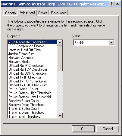 Для ОС Linux предлагаются лишь драйвера для ядра 2.2.х. В ядрах версии 2.4.х они не собираются, поэтому использовался встроенный в ОС драйвер «National Semiconduct DP83820» версии 0.18. Но в ней задан максимальный размер Jumbo Frame — 8192. Причем не правя исходный код драйвера, невозможно выставить размеры пакета, более 1500.