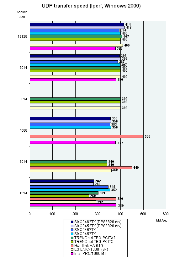 Intel PRO 1000/MT лидирует на малых размерах фреймов, но при размере 6000 все карты показывают уже приблизительно одинаковые результаты. А вот на размере Jumbo Frame в 3000 произошло абсолютно непонятное падение скорости у TRENDnet TEG-PCITX.
