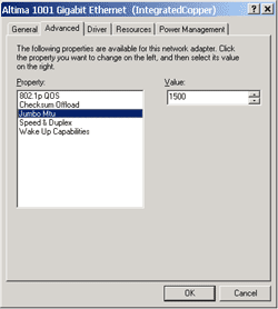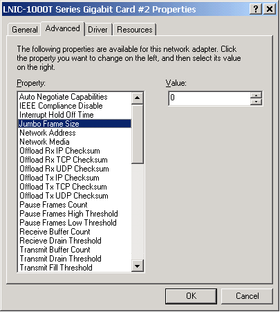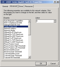 Последние версии драйверы для обоих ОС брались с сайта компании. Версия драйвера в Windows 2000 — 6.4.16, он предоставляет богатые возможности по конфигурированию адаптера. Размер Jumbo Frame задается дискретными значениями в 4088, 9014 и 16128 байт.