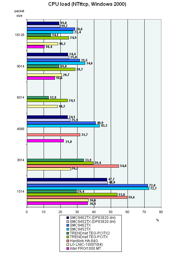 Каждый TCP тест запускался 15 раз, после чего выбирался лучший (по скорости) результат. В случае NTttcp загрузка процессора измерялась встроенными средствами программы, а в Iperf — с помощью системного монитора Windows 2000.