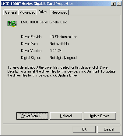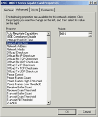 Версия драйвера в Windows 2000 тоже 5.0.1.24. Но его интерфейс предоставляет намного меньше настроек сетевого адаптера, чем у предыдущей карты. Настройки драйвера тоже были оставлены по умолчанию. Верхний предел размера Jumbo Frame неизвестен, но максимальный используемый при тестировании размер (16128 байт) устанавливался без проблем.