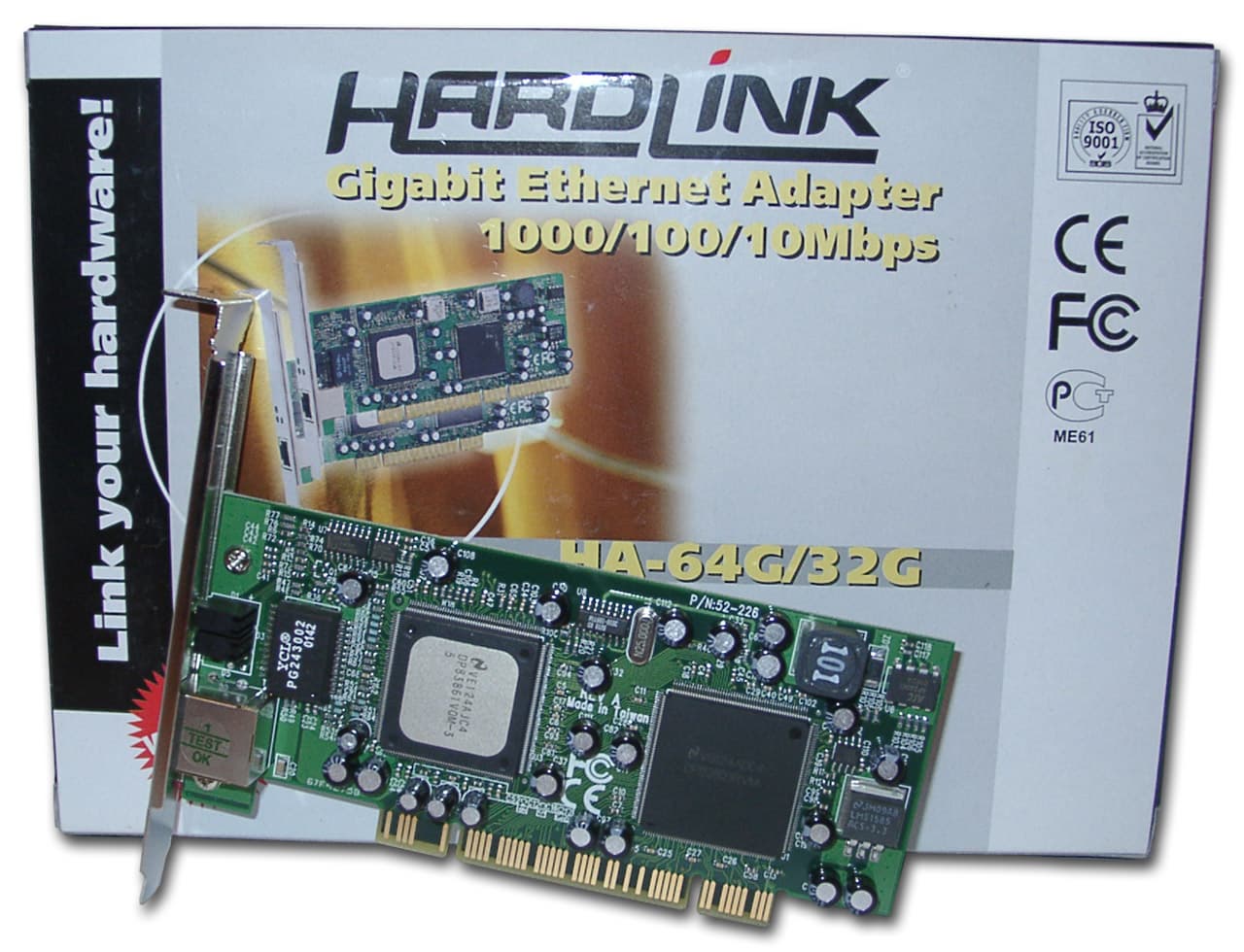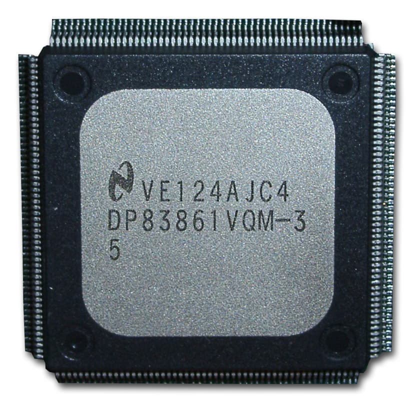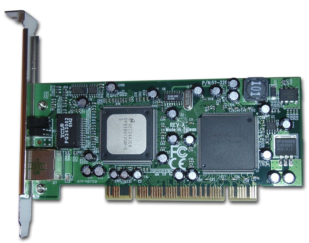 Двухчиповая карта использует микроконтроллеры от National Semiconductor Corporation. Карта имеет 6(!) светодиодных индикаторов, три из которых несут информацию о скоростях 10/100/1000 Мбит (3 индикатора), а остальные три показывают наличие коллизии, передачи данных и режима полного дуплекса. Один из контроллеров карты DP83861VQM-3 скрыт под радиатором. Он является трансивером физического уровня и может работать на скоростях 10/100/1000 Мбит/сек в режимах полу- и полного дуплекса. Поддерживает режим автосогласования скоростей и режимов из вышеназванного списка (IEEE 802.3u Auto-Negotiation).
