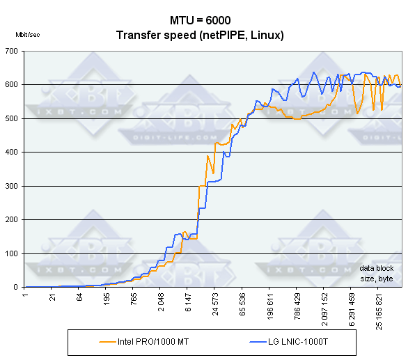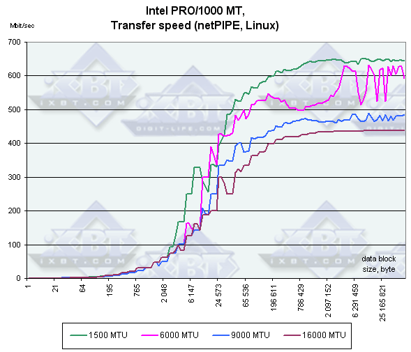 При отсутствии Jumbo Frame Intel PRO 1000/MT, как обычно, лидирует, а вот при их включении карты меняются местами, и их скорость сравнивается только на очень больших размерах передаваемых блоков данных.