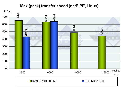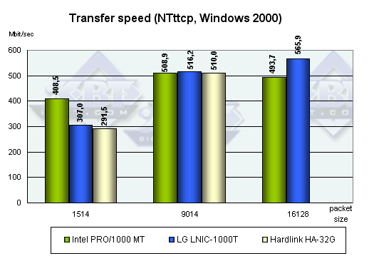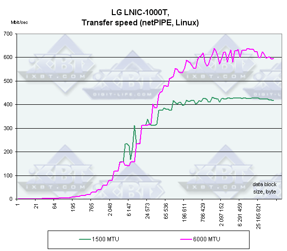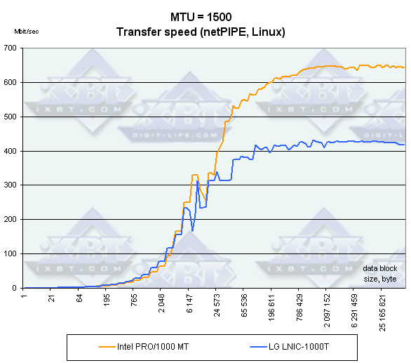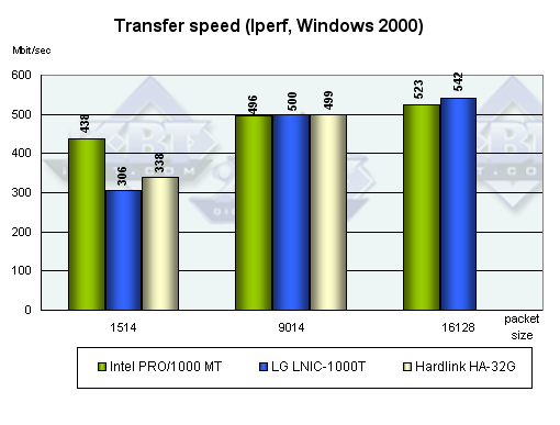Как ни странно, при увеличении размера кадра скорость у адаптера PRO 1000/MT только падает. Наверное, виноват все-таки драйвер. Зато у LNIC-1000T тут все в порядке.