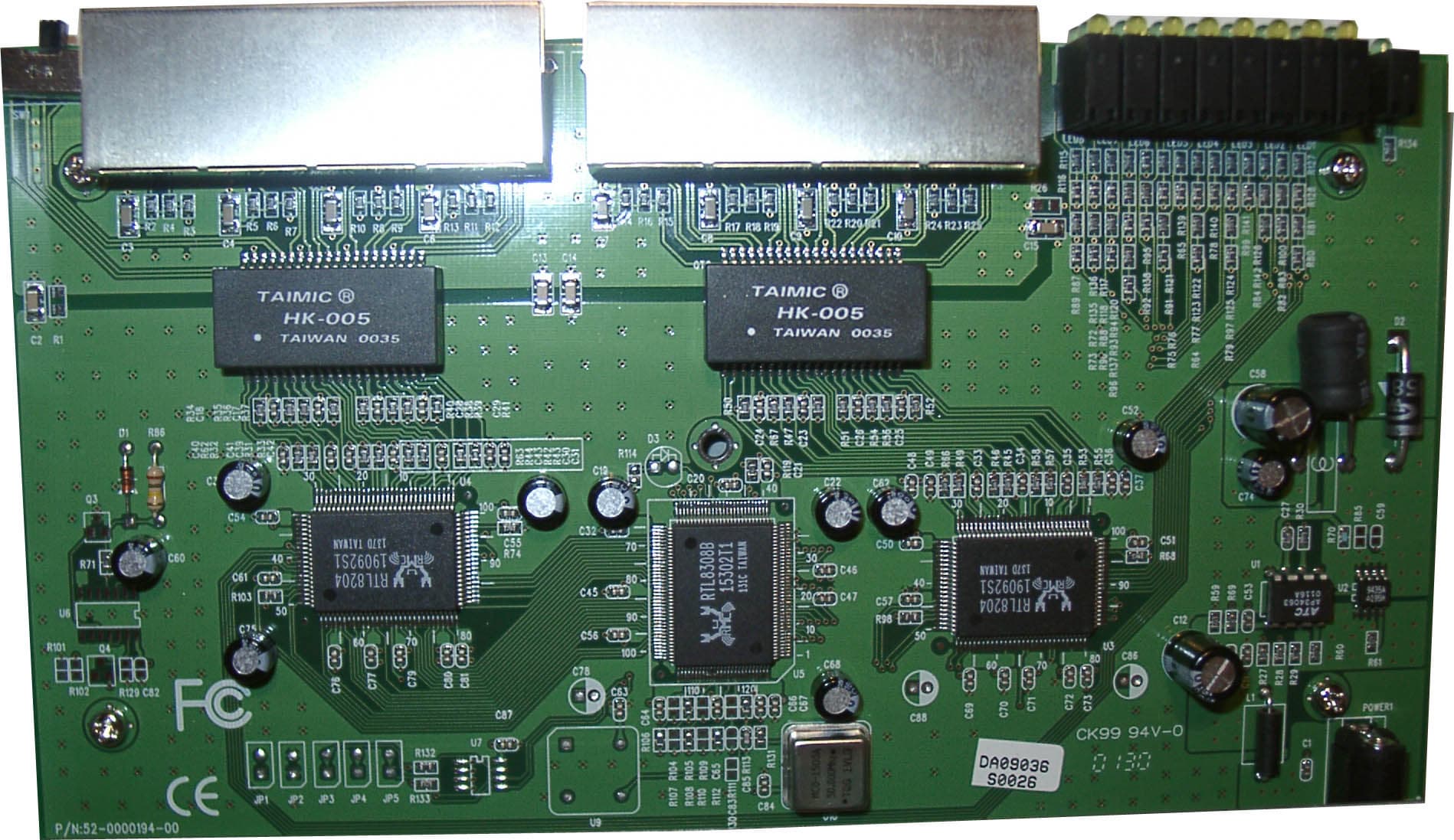 HS-08 собран на уже рассмотренном ранее микроконтроллере RTL8308B компании Realtek. Контроллер содержит в себе буфер кадров объемом 2 мегабита и таблицу MAC на 8K адресов. Для восьми-портового миникоммутатора это более чем достаточно.