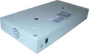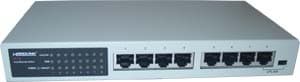 Также возможна установка коммутатора на стене (для этого есть отверстия снизу корпуса) или же можно поставить его на стол, предварительно наклеив снизу резиновые ножки. В этой модели и разъемы портов, и индикаторы расположены на передней панели, сзади остался только разъем питания. Блок питания аналогичен предыдущему. Аплинк порт совмещен с восьмым портом коммутатора, смена режима работы производится двухпозиционным переключателем.