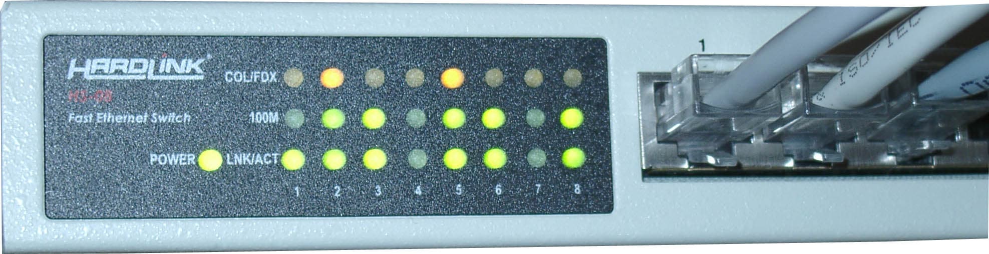 В коммутаторах применен различный подход к индикации информации о портах. В пяти-портовой модели всего по два индикатора на порт, но один из них (link/act) двухцветный. Когда он оранжевый скорость порта 100Mbit, а в 10Mbit-ном режиме он горит темно-зеленым. На фотографии это видно. Такой подход обеспечивает более удобное представление информации, чем в восьми-портовой модели. В ней на каждый порт приходится по три индикатора и, хотя они различных цветов, ни один из них двухцветным не является.