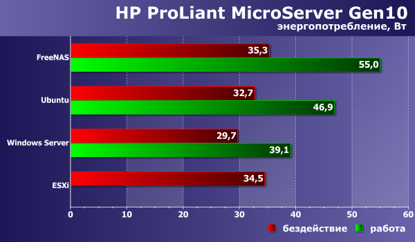 На следующем графике приводятся измерения энергопотребления «из розетки» для нескольких операционных систем — среднее в режиме бездействия за пятнадцать минут и максимальное в режиме нагрузки операциями чтения и записи файлов в описанной выше отказоустойчивой конфигурации. Для VMware ESXi использован только первый режим.