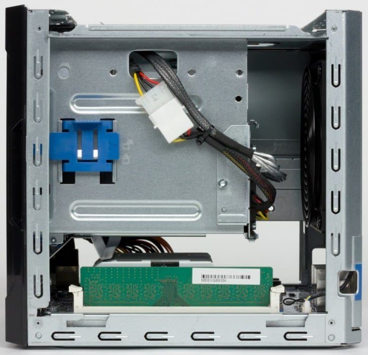 После снятия верхней крышки, что является штатной операций для конечного пользователя, вы получаете доступ к слотам оперативной памяти, слотам расширения и месту установки оптического привода или SSD.