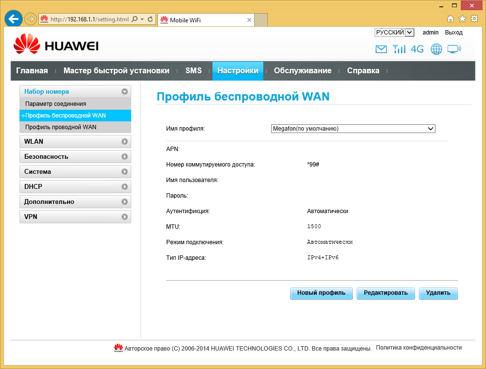 Для беспроводного соединения можно создать несколько профилей с разными настройками APN и быстро переключаться между ними. Отметим, что в интерфейсе есть пункты для работы с PIN-кодом. Для данного типа подключения можно дополнительно выбирать тип сети (автоматически, 2G, 3G, 4G) и оператора.