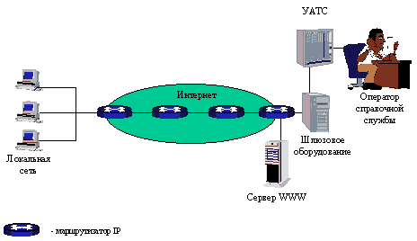 Сценарий "компьютер–телефон" находит применение в различного рода справочных и информационных службах Интернет, например, в службах технической поддержки (рис. 5). Данный сценарий реализуется на оборудовании компании, предоставляющей справочную информацию. Пользователь, подключившийся к серверу WWW (World Wide Web) какой-либо компании, имеет возможность обратиться к оператору справочной службы. Речевое соединение между пользователем и оператором будет установлено, когда пользователь выберет соответствующий пункт меню на странице WEB.